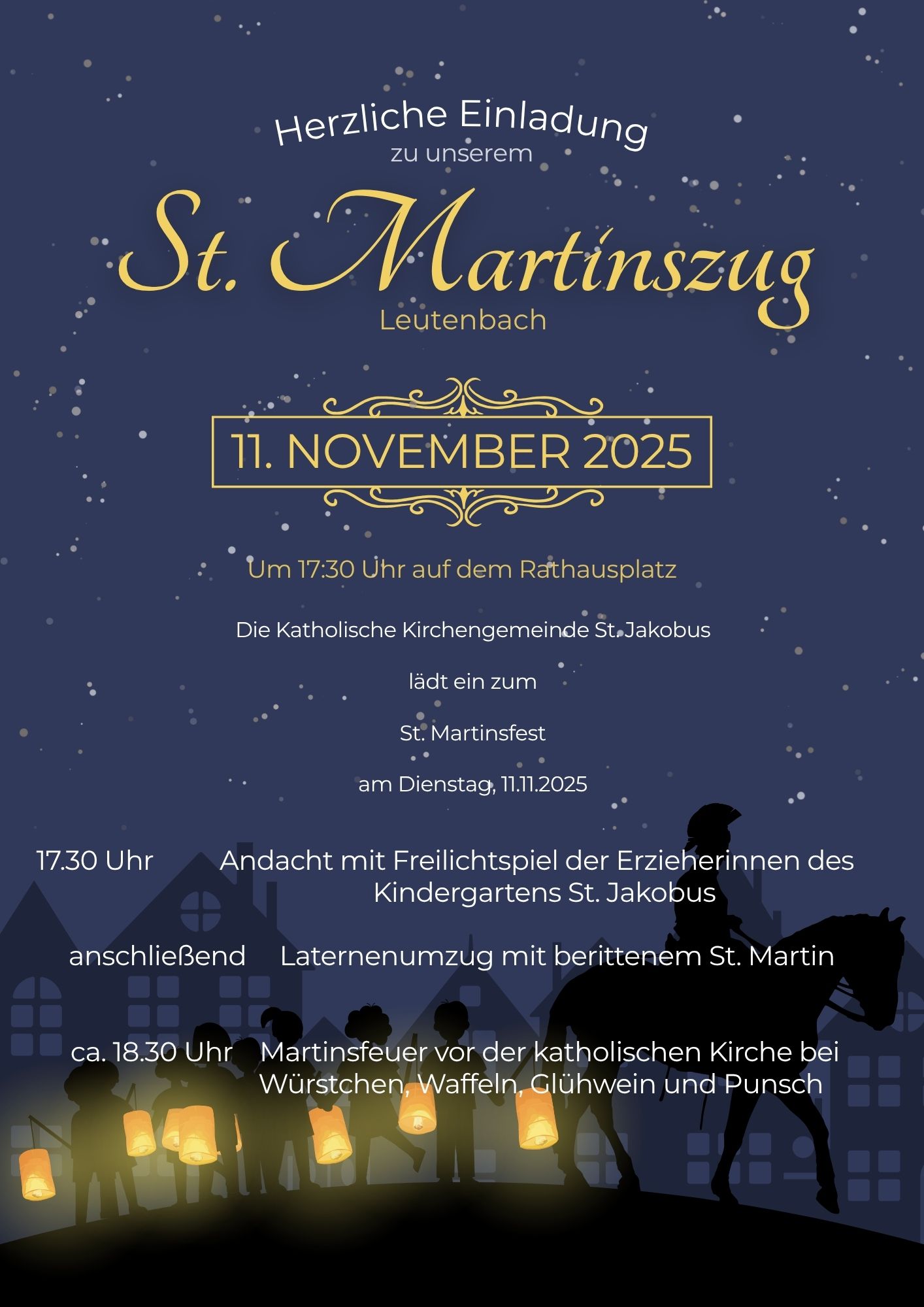 Die Geschichte des St. Martin wird von den Erzieherinnen des Katholischen Kindergartens St. Jakobus unter Fackelbeleuchtung vorgespielt. Der Musikverein Leutenbach begleitet das Anspiel musikalisch. Anschließend begleiten wir den Martinsreiter mit einem Laternenzug durch die Straßen Leutenbachs. Wir enden an der katholischen Kirche, wo ein gemütliches Feuer auf uns wartet. Dort können wir uns bei Punsch oder Glühwein aufwärmen und dazu genüsslich eine Waffel oder Saitenwürstchen essen. Der Erlös aus dem Verkauf der Getränke kommt den Ministranten zugute, der Erlös aus dem Verkauf der Waffeln dem Jugendförderverein JUKK|S!