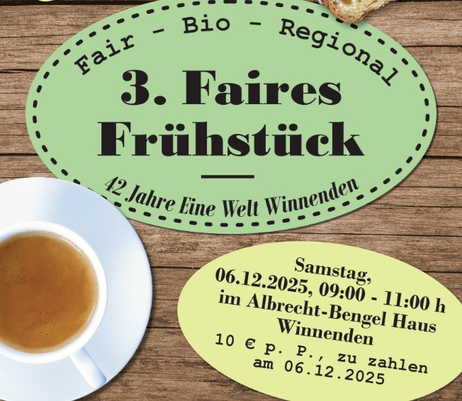 Am Samstag, den 06. Dezember findet das 3. Winnender „Faire Frühstück“ statt. Die „Fairen Kirchengemeinden“ aus Winnenden und Umgebung laden gemeinsam mit dem Weltladen Winnenden ein zu einem leckeren Frühstück mit fair gehandelten und nachhaltigen Produkten aus der Region und aller Welt. Beginn ist ab 09:00 Uhr im Albrecht-Bengel-Haus, der Kostenbeitrag beträgt 10 EUR pro Person.